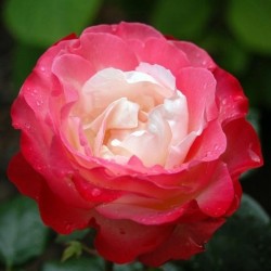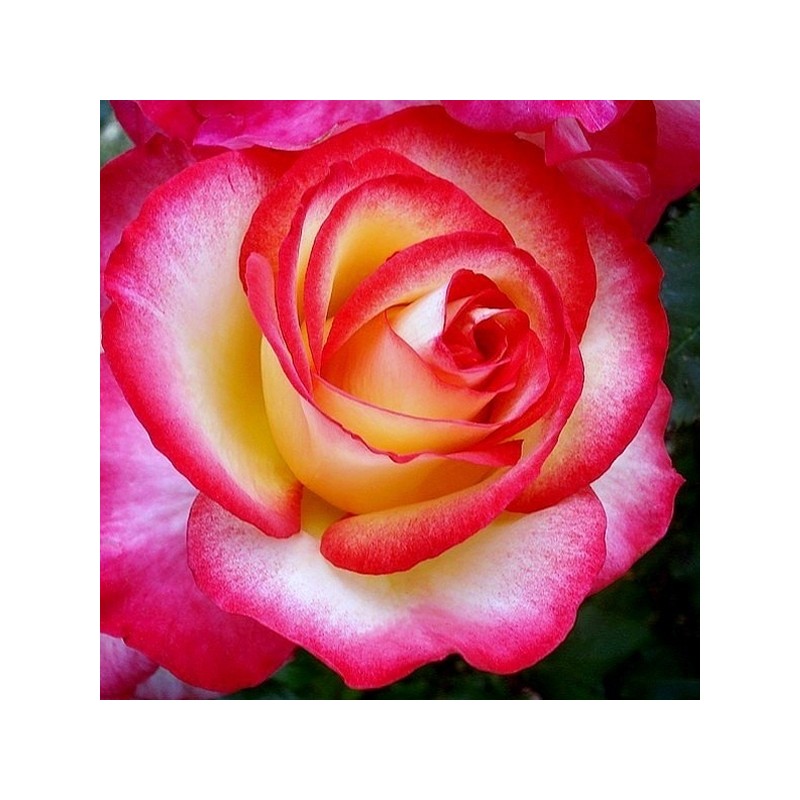 Rosier buisson à grandes fleurs (30/40 pétales) d'un coloris au contraste exceptionnel : Bicolore blanc nuancé d’or ourlé d’un rouge carmin lumineux.
