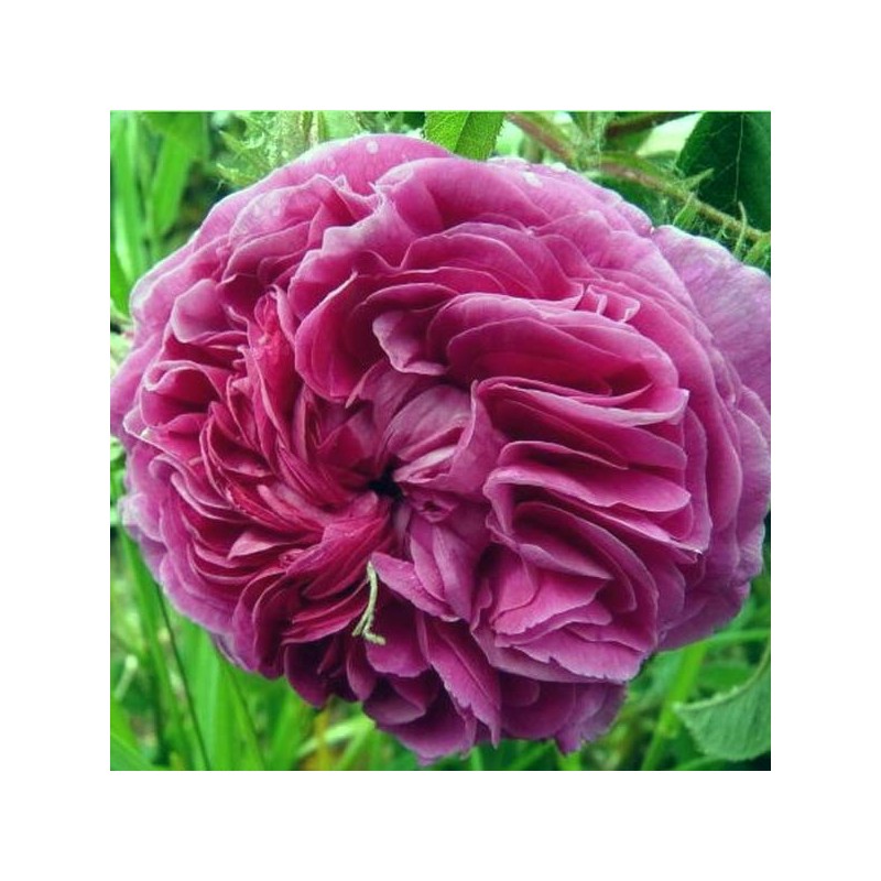Un gallique aussi appelé "Bizare triomphant", en juin les fleurs sont pleines en forme de quartier, d'un rouge pourpré irisé de cramoisi qui éclosent en coupe presque plat.