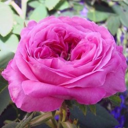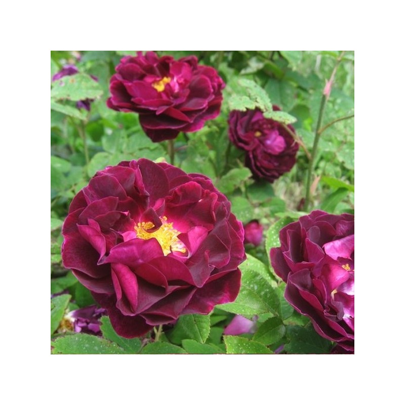 Rosier ancien avec un joli coloris pourpre illuminé par de saillantes étamines jaunes.