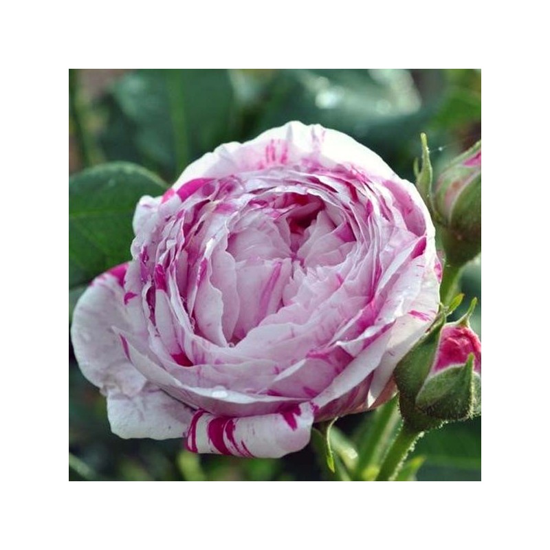 - Rosier au coloris Blanc rosé jaspé de rouge pourpré.