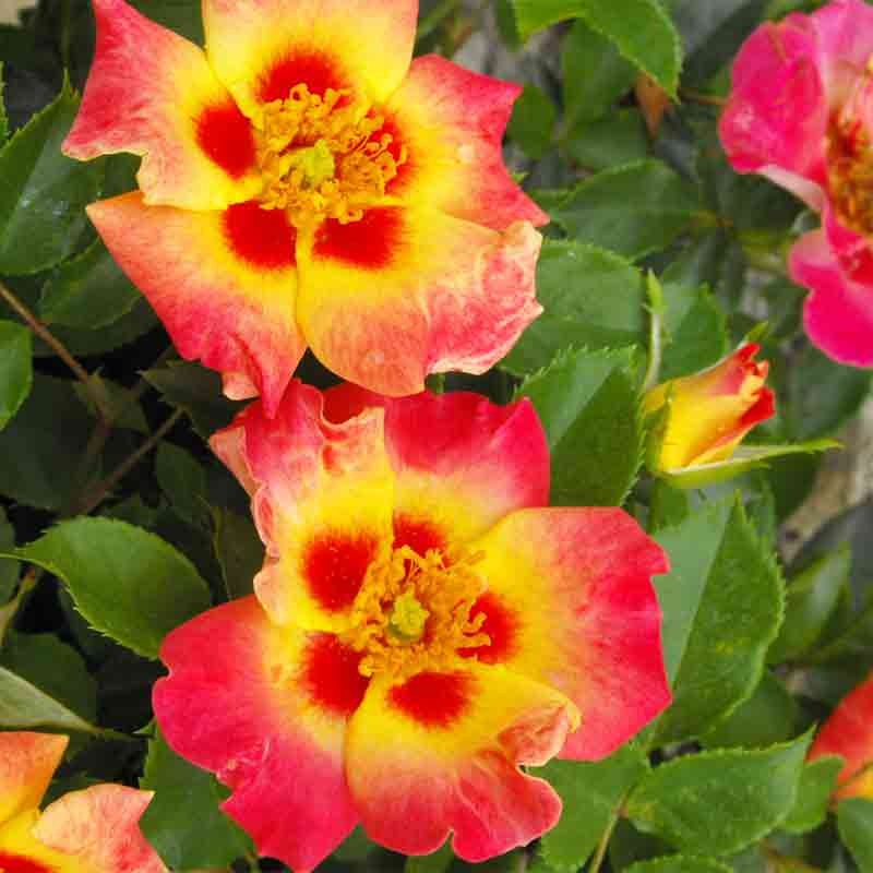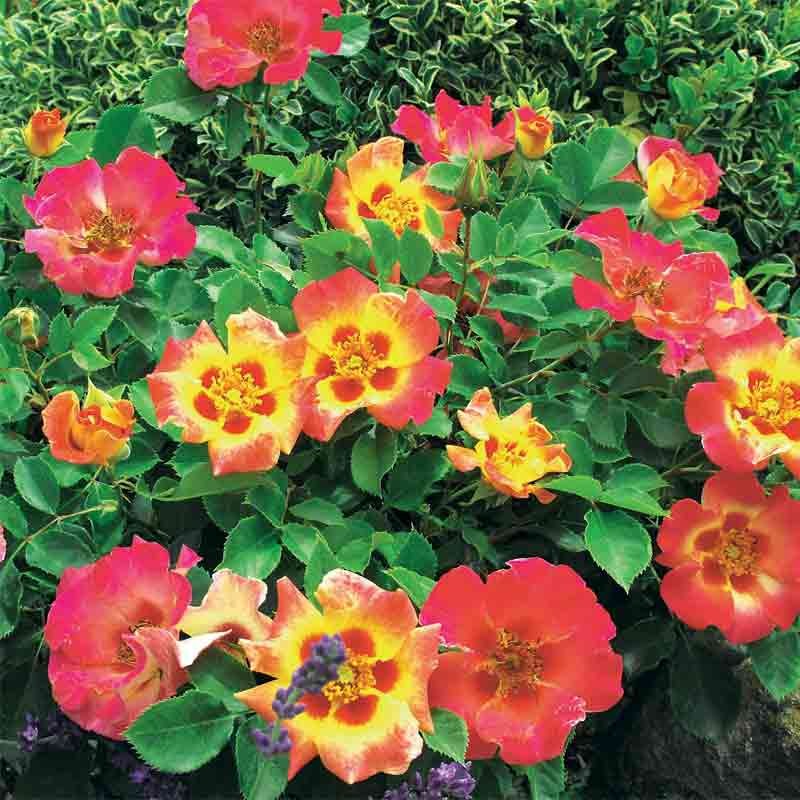 - Rosier à port compact et original de par des fleurs multi-colorées