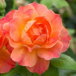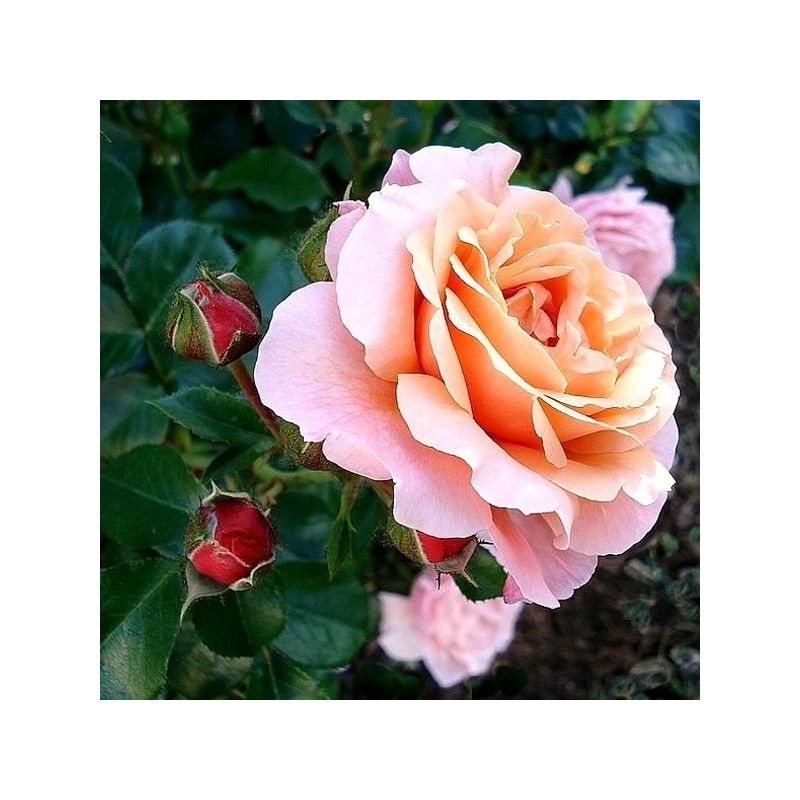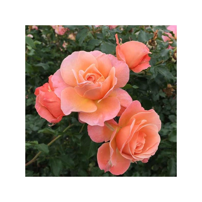 - Ce rosier au coloris orange très clair bordé de rose pâle, au feuillage dense vert foncé, bénéficie d’une floraison abondante.