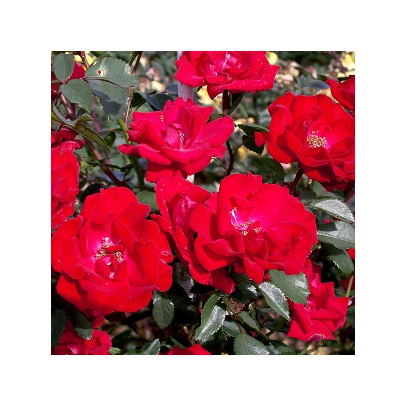 Fleurs semi-doubles d'un rouge vif lumineux en bouquets.