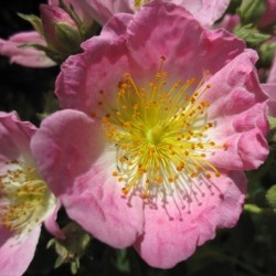-Rosier grimpant ancien qui produit des bouquets de fleurs simples, en groupe, très élégantes avec des étamines saillantes d'un jaune lumineux.