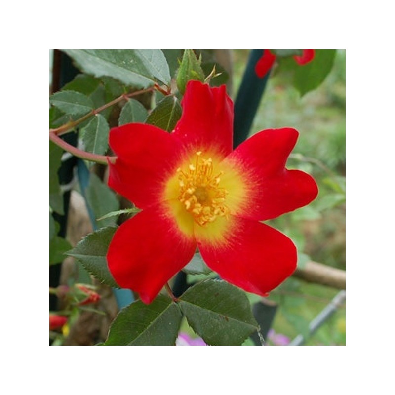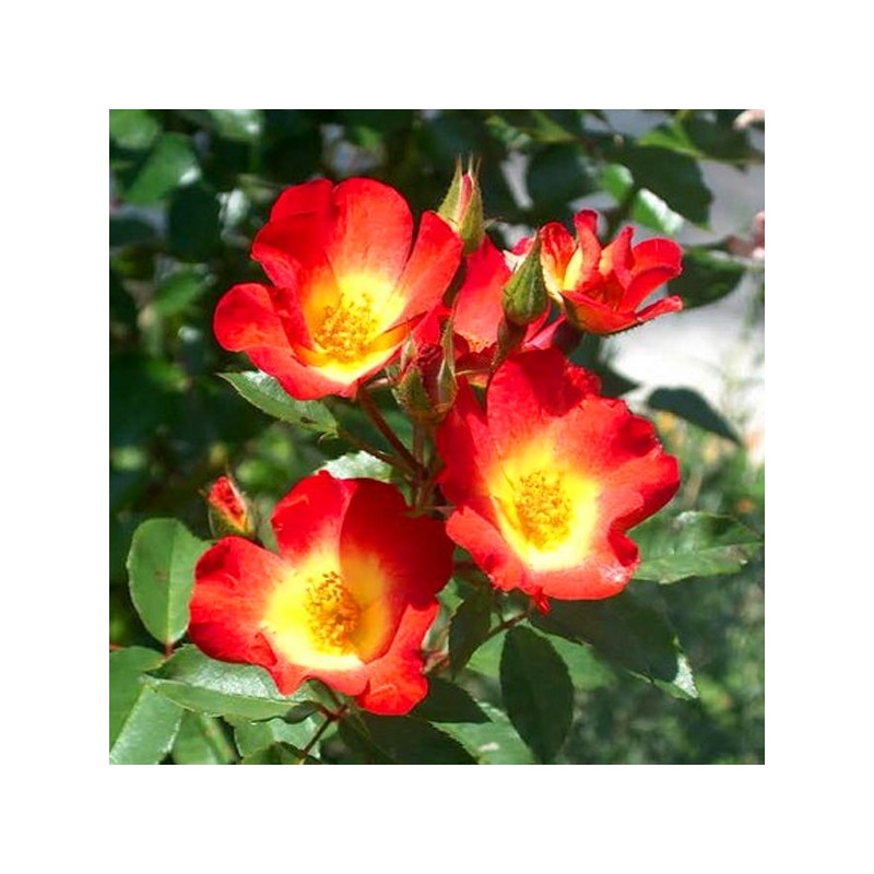 Des fleurs simples à 5 pétales, un vif coloris rouge géranium sur le pourtour, jaune primevère au centre.