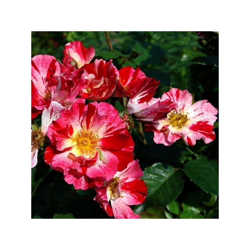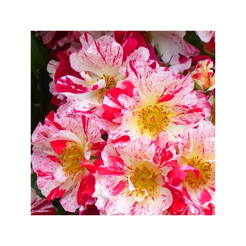 Un véritable Feu d'Artifice de fleurs simples à semi-doubles, panachées de rouge et de blanc.