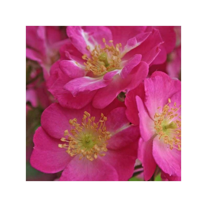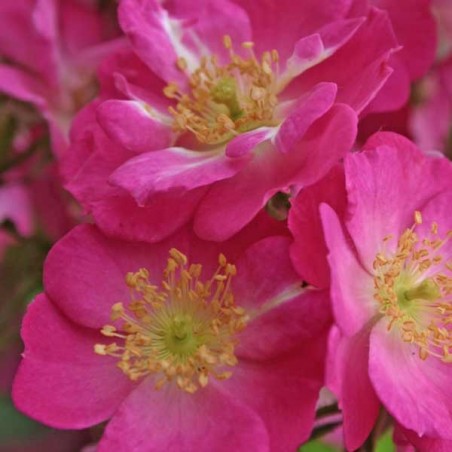 - Fleurs simples de 5-6 cm de diamètre d'un rose Magenta avec des reflets violet laissant apparaitre de lumineuses étamines Jaune d'or.