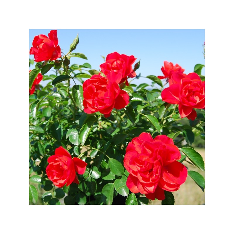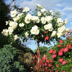 - Rosier sur tige arbustif à port recouvrant (peut-être conduit en couvre-sol par une taille sur la partie haute)